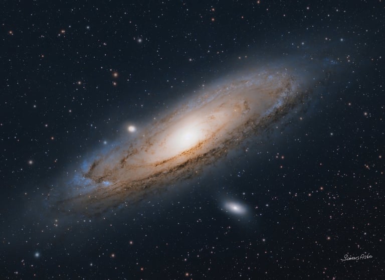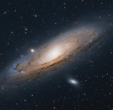 The Andromeda Galaxy, located approximately 2.5 million light-years from Earth, is the closest spiral galaxy to our own Milky Way. It is a magnificent celestial structure, harboring an estimated one trillion stars, making it one of the largest galaxies in our local group. Its majestic spiral arms are filled with young, hot stars and clouds of gas, creating a beautiful contrast against the dark cosmic backdrop. As Andromeda and the Milky Way are on a collision course, astronomers study this galaxy to understand the evolution of galaxies and the dynamics of cosmic interactions. I shot this with my Askar FRA400 and one shot colour camera, a total of on 1 hr integration.