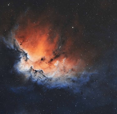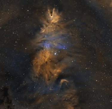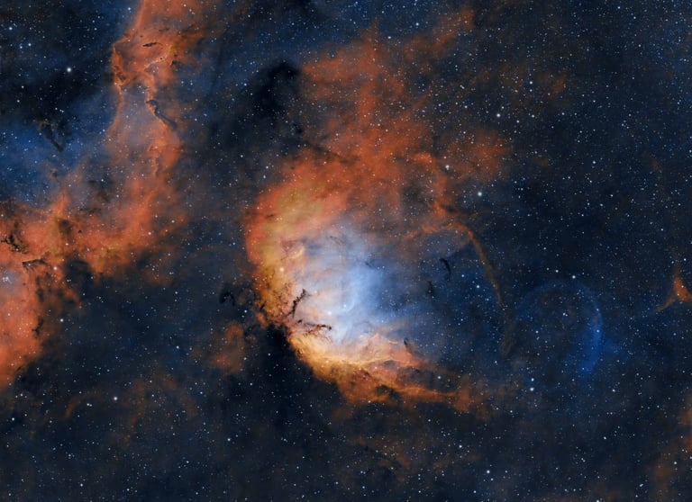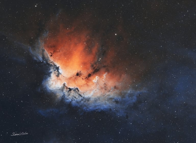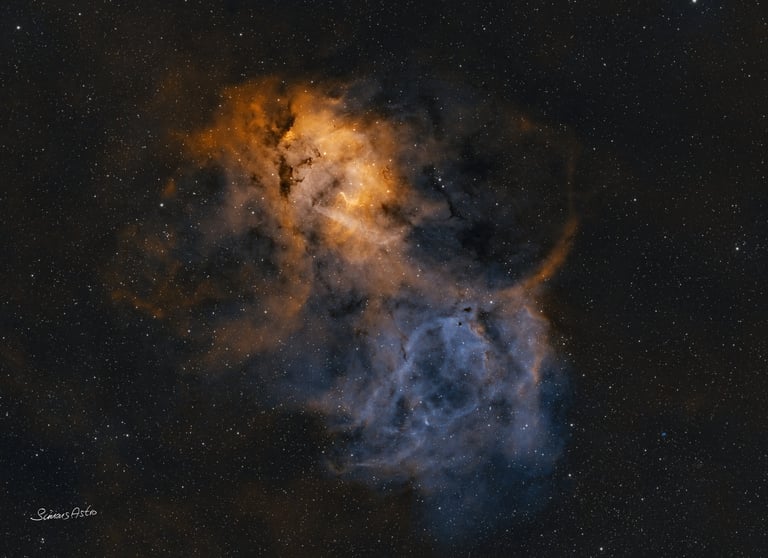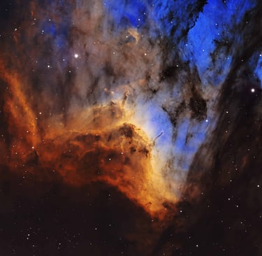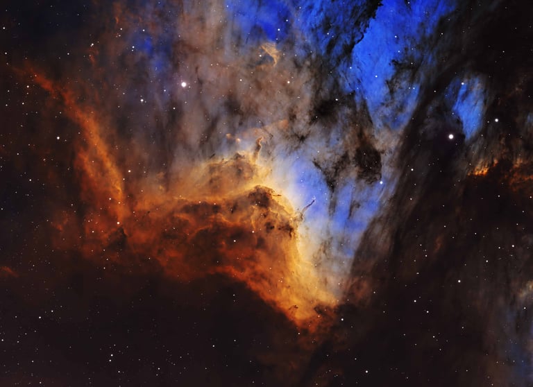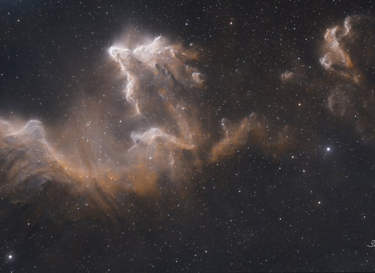 The Pelican Nebula, located approximately 1,800 light-years away from Earth, is an intriguing region of star formation that captivates astronomers and stargazers alike. This stunning nebula, part of the larger IC 5070 complex, is notable for its distinctive shape that resembles a pelican in flight, hence its name. Composed primarily of hydrogen gas and dust, the Pelican Nebula serves as a cosmic nursery, where new stars are born amid swirling clouds of interstellar material. This image is only 2hrs and 40 mins of Sii, Ha and Oiii data shot with the 2600mm camera and Esprit 120 telescope.