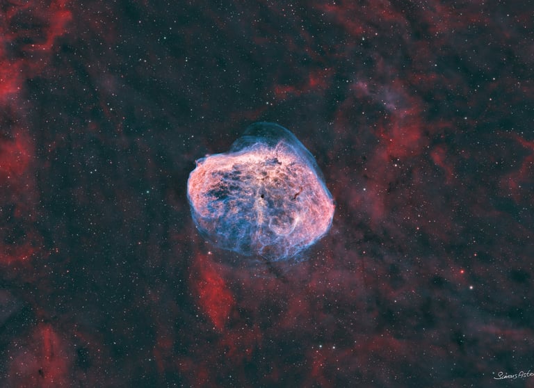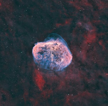 The Crescent Nebula, also known as NGC 6888, is a stunning emission nebula located in the constellation Cygnus. This celestial object is formed from the stellar winds and gases expelled by a dying star, specifically a Wolf-Rayet star. The nebula's unique shape resembles a crescent, which is a result of shock waves interacting with the surrounding interstellar medium. The bright, intricate structures of the nebula are composed of ionized gases, predominantly hydrogen and helium, which emit a dazzling array of colors when illuminated by the intense radiation from the central star. 52 Hrs total with ZWO 2600mm Pro camera and the Skywatcher Esprit 120 at 840mm.
