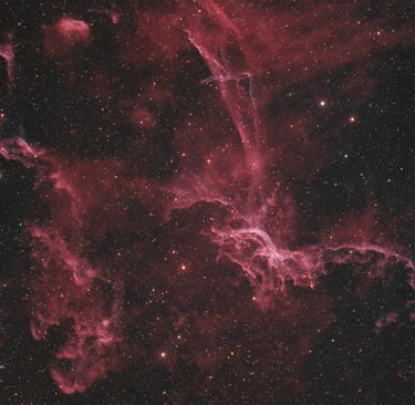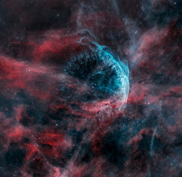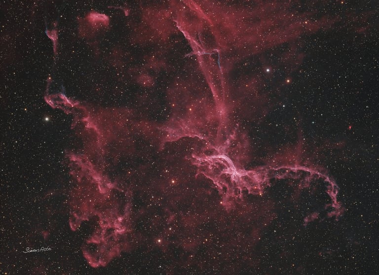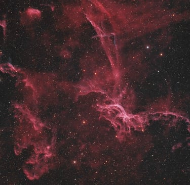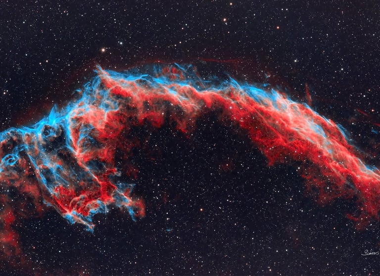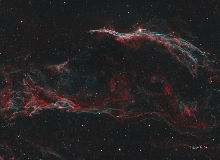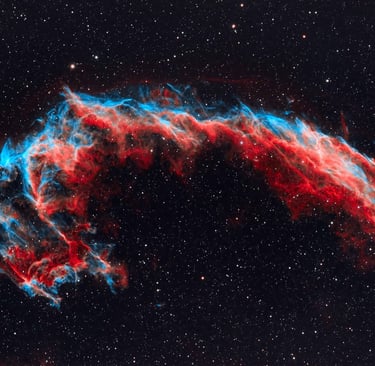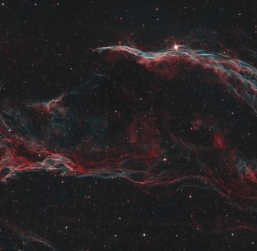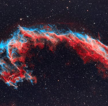 The East Veil Bat Nebula, (NGC 6992) part of the larger Veil Nebula complex, is a stunning remnant of a supernova explosion that occurred around 5,000 to 8,000 years ago. This celestial structure is located in the constellation Cygnus and showcases intricate filaments of gas and dust that shimmer with the light of distant stars. The nebula's delicate filaments are primarily composed of ionized hydrogen, contributing to its ethereal appearance. Photographers and astronomers often target this region for its striking visuals, especially in color-enhanced images that reveal a spectrum of hues, including blues, reds, and greens.