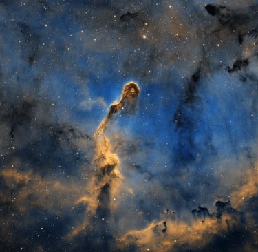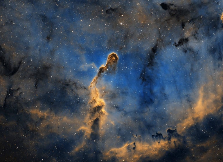 The Elephant's Trunk Nebula, officially known as IC 1396A, (2400 light years away) is a stunning region of star formation located in the constellation Cepheus. This nebula gets its name from its distinct shape, which resembles the trunk of an elephant stretching through space. Composed of gas and dust, the Elephant's Trunk serves as a stellar nursery, where new stars are born from the dense material within. The area is part of a larger complex known as the IC 1396 nebula, which contains a rich tapestry of vibrant colors and intricate structures formed by nearby stars and the obscuring dust. This image was captured with my Esprit 120, reduced to 648mm on the 2600 mono camera, a total of 5hrs:30mins with SHO 3nm Antlia filters.
