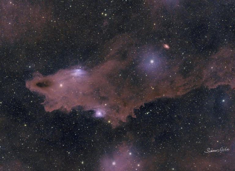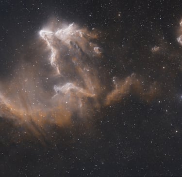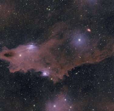 The Lion Nebula, also known as SH2-132, is a faint emmisions nebula located in the constellation of Cepheus. This massive region of star formation, showcases intricate structures of gas and dust illuminated by the energy of newborn stars. It is part of a molecular cloud complex situated relatively close to the Milky Way, approximately 800 light-years from Earth. This nebula is renowned for its striking features, including the intricate patterns of gas and dust that give it a distinct appearance, resembling the mane of a lion. I took this image with my 2600 ZWO One Shot Colour camera and the Askar FRA 400, a total of 15hrs of data.