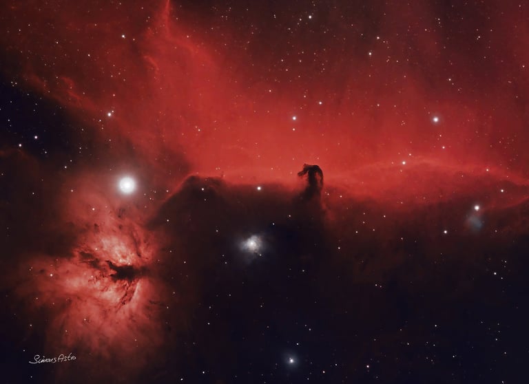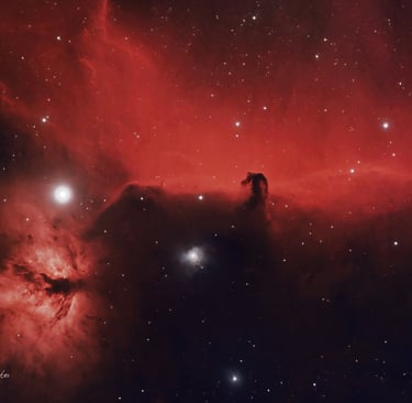 The Horsehead Nebula, located in the constellation Orion, is one of the most iconic nebulae in the night sky. This dark molecular cloud stretches approximately 3.5 light-years tall and is best known for its striking horsehead shape, which can be seen against the backdrop of glowing hydrogen gas in the surrounding region. The nebula is a stellar nursery, where new stars are born amidst the dense gas and dust. Although it appears dark in visible light, the Horsehead is illuminated in infrared, revealing the intricate structures within. Its distance from Earth is approximately 1,500 light-years away. This was taken with my ZWO 2600 One Shot Colour camera and Optolong LExtreme filter, a total of 2hrs data.