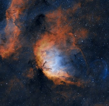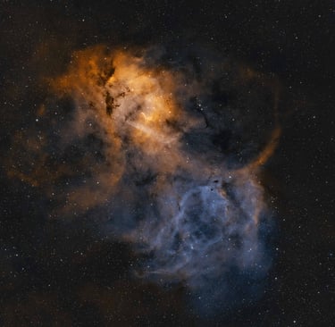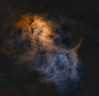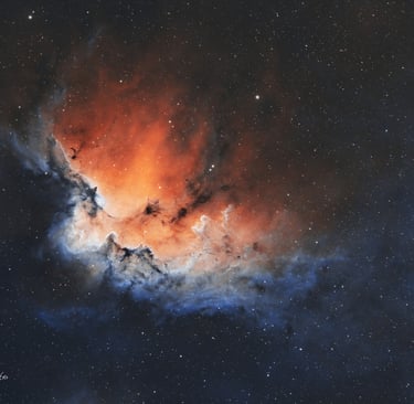 The Wizard Nebula, also known as NGC 7380, is an enchanting open cluster and emission nebula located in the constellation Cepheus. Discovered by the astronomer Carolyn Herschel in 1787, this stunning cosmic formation lies approximately 7,200 light-years away from Earth. The nebula is notable for its ethereal, wispy appearance, resembling a wizard conjuring magic, which gives it its name. NGC 7380 is home to a young group of stars, which play a crucial role in the surrounding gas and dust. This was taken with my ZWO 2600 mono camera and the Skywatcher Esprit 120 at 840mm. A total of 10hrs of SHO data with the 3nm Antlia filters.