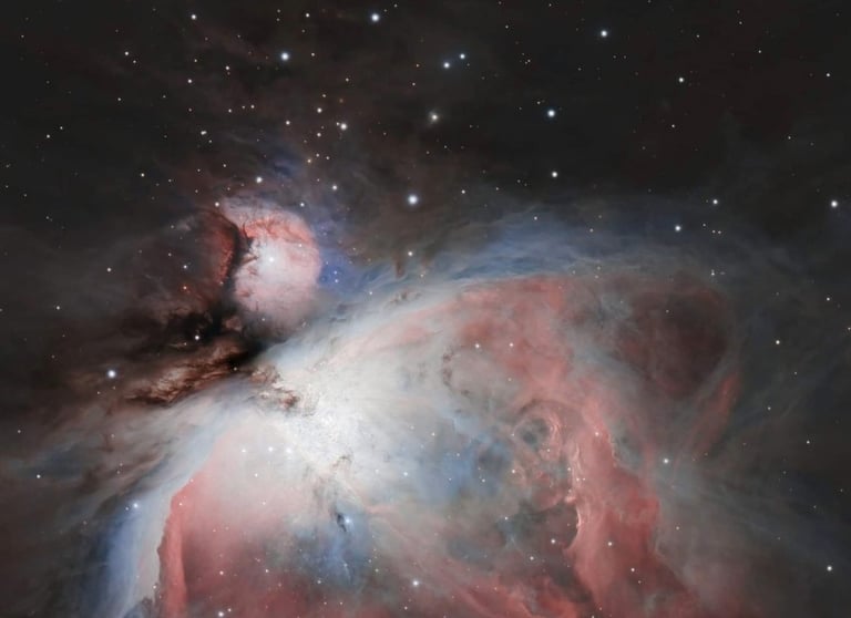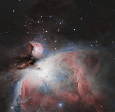 The Great Orion Nebula, (and Running Man) a stunning celestial masterpiece, is located approximately 1,344 light-years away from Earth. This vibrant region of star formation is nestled within the Orion constellation and serves as a stellar nursery, where new stars are born from the dense clouds of gas and dust. With its mesmerizing colors and intricate structures, the nebula captivates astronomers and stargazers alike. Observing the Orion Nebula through powerful telescopes reveals a dynamic and evolving environment, teeming with the potential for future star systems. Shot with my ZWO 2600mc pro one shot colour camera, and the Esprit 120ED at 840mm. I used the Optolong L Pro filter and imaged a total of 2hrs & 8 mins, using short exposures of 20 secs.