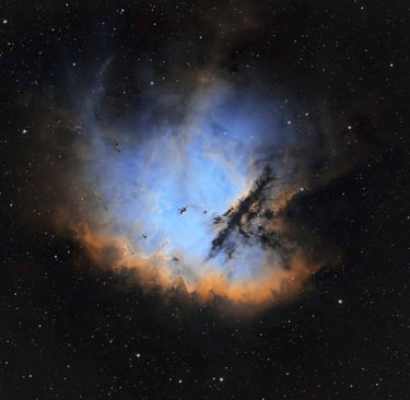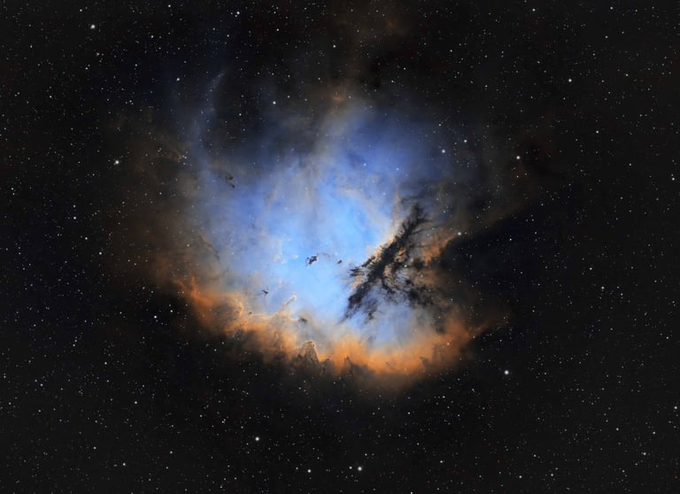 The Pacman Nebula, also known as NGC 281, is located approximately 8,000 light-years away from Earth and is a mesmerizing region of star formation in the constellation Cassiopeia. Known for its distinct resemblance to the classic arcade character Pacman, this vibrant nebula is an intricate tapestry of gas and dust. The nebula emits a captivating glow, fueled by the energetic processes of newly formed stars. I shot this image with the Starwave Acent 130 APO on loan from Altair Astro. Its a total of 3hrs of SHO data shot with the ZWO 2600mm pro camera and the 3nm Antlia filters.