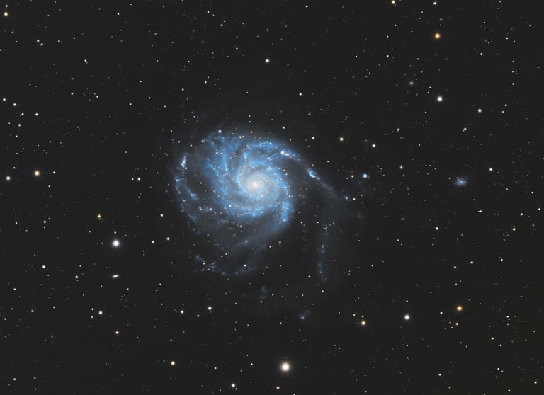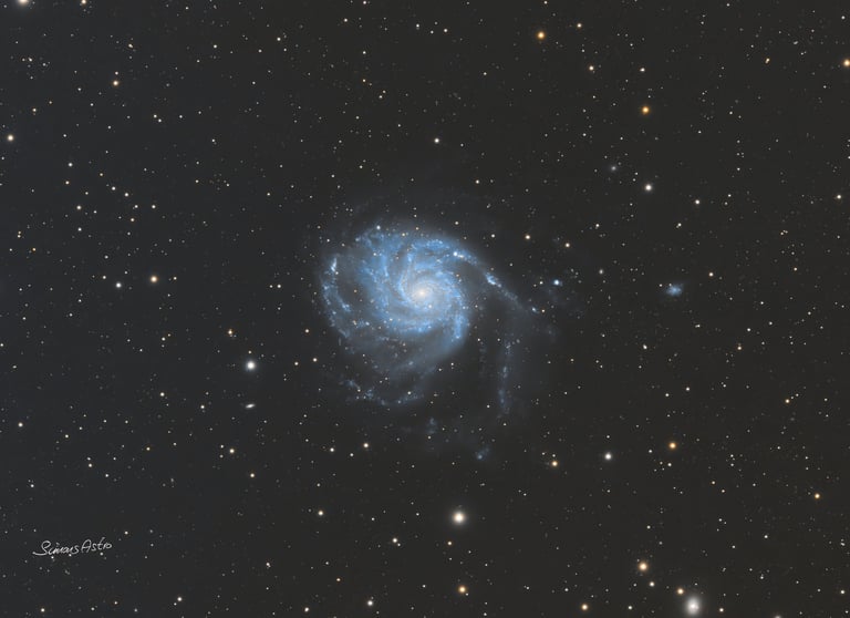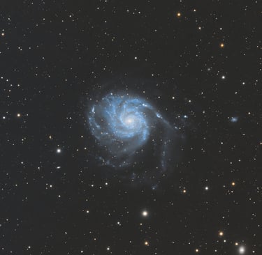 The Pinwheel Galaxy, also known as M101, is an exquisite spiral galaxy located approximately 21 million light-years away from Earth. This stunning celestial body is renowned for its well-defined spiral arms, which are rich in star formation and vibrant clusters of young stars. The galaxy spans about 170,000 light-years in diameter, making it larger than our Milky Way. Its bright core is surrounded by a halo of gas and dust, contributing to its spectacular appearance in the night sky. The Pinwheel Galaxy offers astronomers a valuable opportunity to study the processes of galaxy formation and evolution. The was shot with my 2600 mono camera just 7.5hrs using the LRGB 3nm Antlia filters.