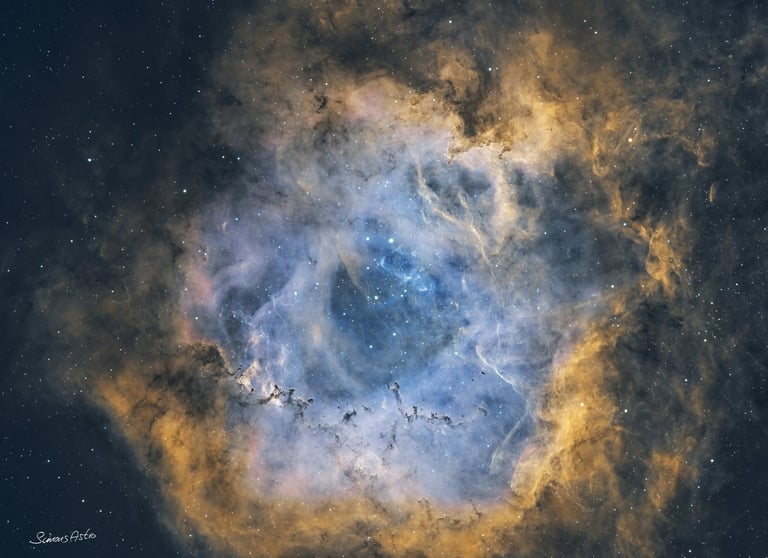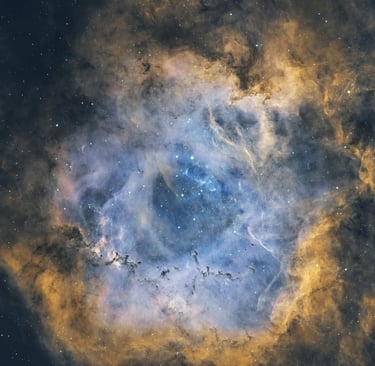 The Rosette Nebula, also known as NGC 2237, is a stunning large emission nebula located in the constellation Monoceros, approximately 4,500 light-years away from Earth. Its name derives from its resemblance to a blooming rose, as the nebula is a crescent-shaped region of bright gas and dust surrounded by a star cluster known as NGC 2244. The Rosette Nebula is a stellar nursery, where new stars are formed from the clouds of hydrogen and other gases. The nebula spans roughly 50 light-years in diameter. This was taken with my ZWO 2600mm camera and Esprit 120 reduced to 648mm at F5.6. A total of 29.5 hrs of Sii, Ha and Oiii data, 3nm Antlia filters.