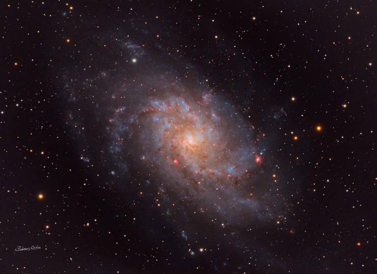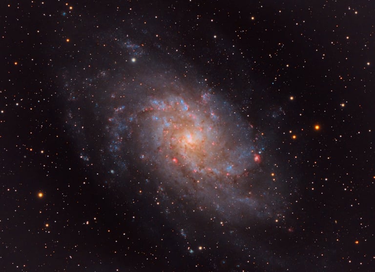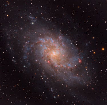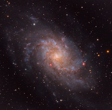 The Triangulum Galaxy, also known as M33, is a stunning spiral galaxy located approximately three million light-years away from Earth, making it one of our closest galactic neighbors. With its diameter of about 60,000 light-years, it is the third-largest member of the Local Group, which also includes the Milky Way and the Andromeda Galaxy. The Triangulum Galaxy is particularly notable for its well-defined structure, featuring numerous star clusters and nebulae, which contribute to its vibrant appearance. This is a total of 4hrs integration time using my ZWO 2600 mc pro one shot colour camera and the Esprit 120ED telescope at 840mm F7