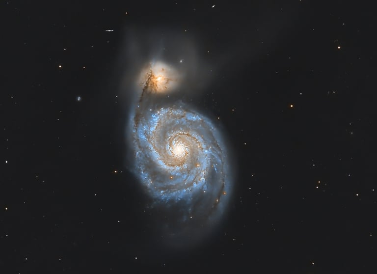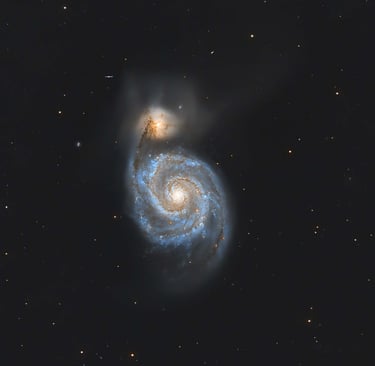 The Whirlpool Galaxy, also known as M51, is an extraordinary spiral galaxy located approximately 23 million light-years away from Earth. Discovered in 1773, it has captivated astronomers and stargazers alike with its stunning appearance and dynamic structure. This galaxy features a well-defined spiral shape, characterized by bright, sweeping arms filled with stars, gas, and dust, creating a beautiful contrast against the dark void of space. Its interaction with the nearby dwarf galaxy, NGC 5195, adds to the fascinating dynamics of the system, resulting in a cosmic dance that influences star formation. This was imaged with my Esprit 120ED and 2600 mono camera, a total of 13.6 hours integration time.