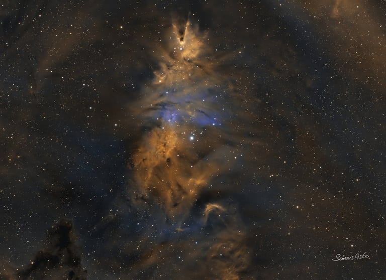 The Christmas Tree Nebula, also known as NGC 2264, is a fascinating region located in the constellation Monoceros, the Unicorn. This striking nebula gets its name from its unique shape, which resembles a decorated Christmas tree against the vast backdrop of space. Illuminated by bright stars, including the prominent S Monocerotis, the nebula serves as a stellar nursery where new stars are being born. The intricate structures within the nebula are primarily composed of gas and dust, providing the necessary material for star formation. A total of just 2hrs and 40 mins exposure of SHO data shot with the Esprit 120 and ZWO 2600 mono.