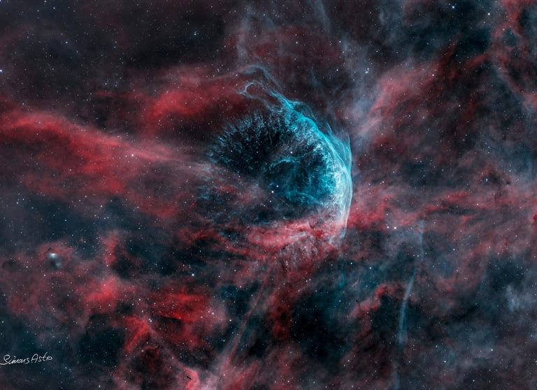 IC 63, commonly known as the Ghost of Cassiopeia, is a fascinating reflection nebula located in the constellation Cassiopeia. This ethereal cloud of gas and dust interacts with the intense radiation emitted from the nearby star, Gamma Cassiopeiae, creating a stunning visual contrast in the night sky. IC 63 plays a vital role in the study of star formation, as it contains various regions where new stars are beginning to emerge. Its proximity to the Cassiopeia constellation, coupled with its ghostly allure, makes IC 63 a compelling object of interest for astrophotographers at 550 light years away. This image was captured with my mono 2600 camera and 3nm Antlia filters, a total of 25hrs SHO data.