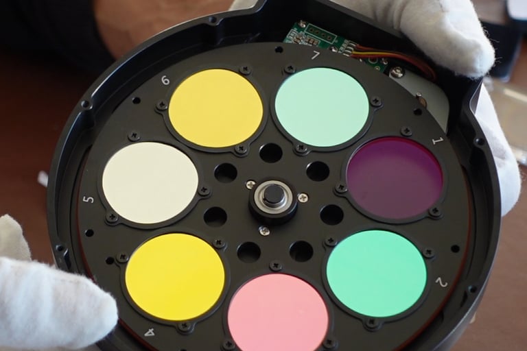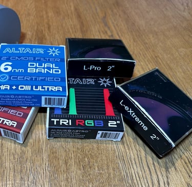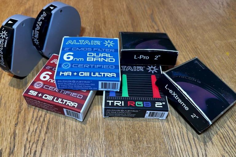In astrophotography, filters play a crucial role in enhancing image quality and revealing celestial details. Various types of filters cater to specific needs, such as light pollution reduction filters, which help in capturing clearer images of stars and nebulae by minimizing the effects of artificial lighting and even moon light. Narrowband filters, on the other hand, isolate specific wavelengths of light, allowing photographers to emphasize particular features in emission nebulae, like the Hydrogen-alpha, Oxygen-III and Sulpher-II lines (Ha, Oiii, Sii).