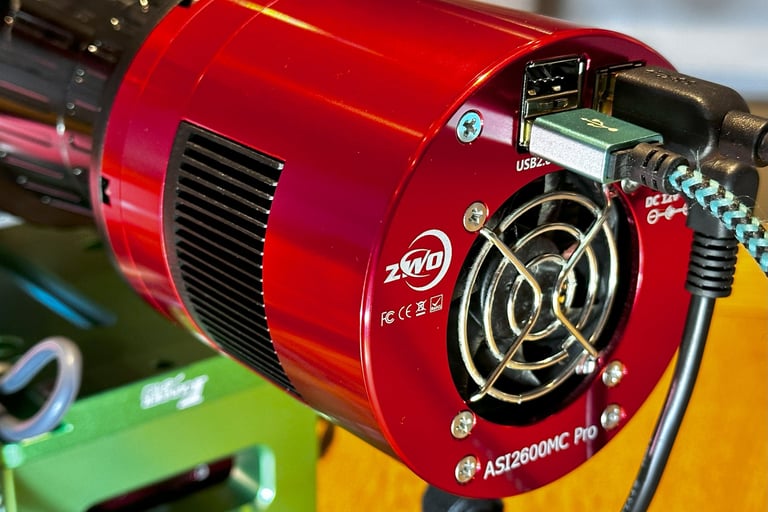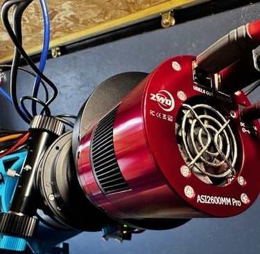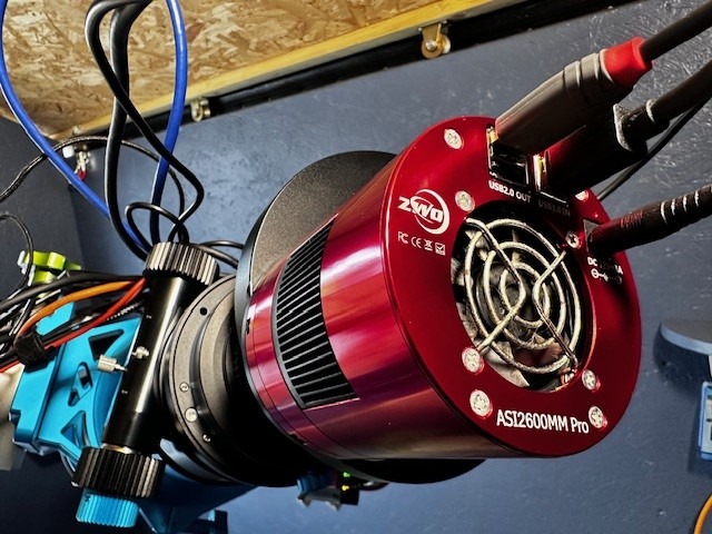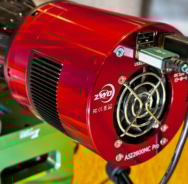 I mainly use two ZWO cooled cameras for imaging, the 2600 mc pro one shot colour camera and the 2600 mm pro mono camera. These are both APS-C sensor cameras, crop sensor (not full frame) using the Sony 26MP IMX571 APS-C sensor and are back illuminated. Both of these cameras have zero amp glow, 2 stage Tec cooling and have a small pixel size of 3.76um.