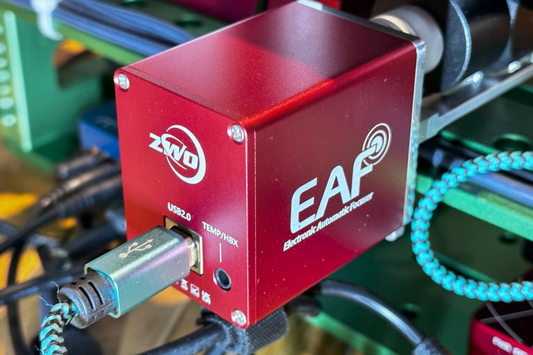ZWO Electronic Automatic Focuser (EAF) This tool is a must if you plan to image through the night. It allows you to set the rig running and leave it, you dont have to worry about focussing, as you can set it to focus in various situations. Change of temp, change of filter, or after a certain time or meridian flip.